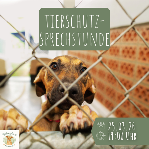 Dann ist die Tierschutz-Sprechstunde genau das Richtige für dich. Hier hast du die Möglichkeit, all deine Fragen zu stellen, Infos und Tipps zum Thema Tierschutz zu erhalten und/oder dich mit Gleichgesinnten auszutauschen.